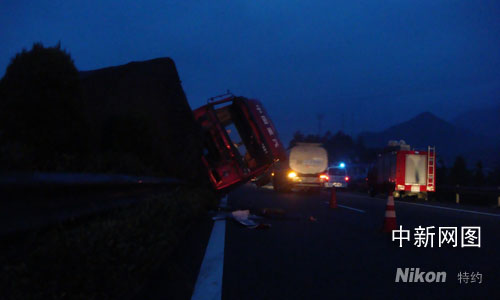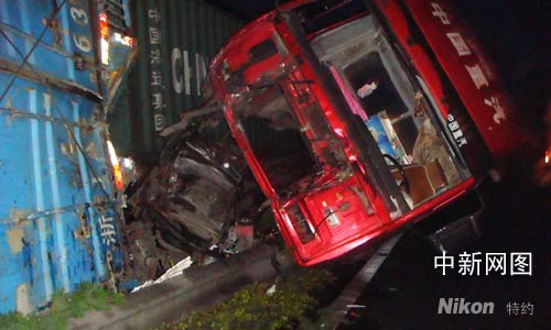 據(jù)了解,第一次追尾的兩輛集裝廂卡車已經(jīng)被分離開,工作人員正在拖離事故車輛。在后方不到兩公里處被堵車輛長隊當中,一輛大型集裝廂卡車(為浙BA9429)的車頭已經(jīng)完全搭在了中間的隔離帶上,駕駛室已經(jīng)竄到了旁邊的另一方向車道上。前面是一輛中型廂式貨車(浙JA6312),已經(jīng)被大卡車撞翻,橫在路中央,在兩輛車右側和前側,先后有四輛車都發(fā)生追尾和刮擦,受傷的(浙JA6312)司機已經(jīng)被救出送往醫(yī)院。