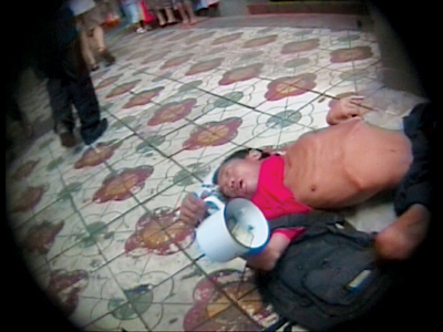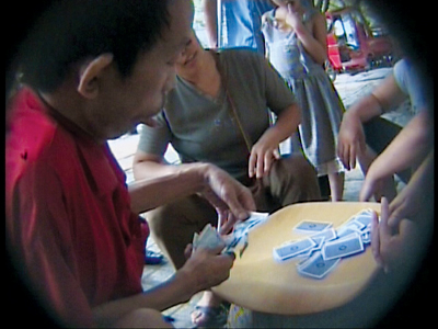 直到中午12點(diǎn)左右,乞討男子悄悄做了個(gè)手勢(shì),綠衣男子立刻跑來將乞討者背在背上離開下河路。“鷹”一邊拍攝,一邊跟著兩人向魚洞車站走去。隨后,兩人坐上開往李家沱的公交車。此后,讓人意想不到的情況發(fā)生了,“鷹”看到,兩人吃過午飯后,乞討者竟來到李家沱車站邊的東南亞農(nóng)貿(mào)市場(chǎng)門口斗地主。