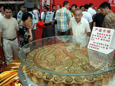 “我們這個(gè)鮮花月餅王直徑1.6米,重1600斤,展示完后將免費(fèi)分給參加月餅節(jié)的市民品嘗!1600斤重的鮮花月餅制作企業(yè)麥的多總經(jīng)理呂元平告訴記者,月餅面上有八個(gè)嫦娥奔月的小圓月餅象征2008年,月餅中間是龍鳳呈翔圖案,四周則有祥云圍繞!斑@個(gè)可供萬人分食的月餅寓意四川人民地震后萬眾一心,希望恢復(fù)祥和美好新生活的祝愿!眳卧酵嘎墩f,大月餅由二十多個(gè)高級(jí)烘焙技師花了五天時(shí)間才制作完成。