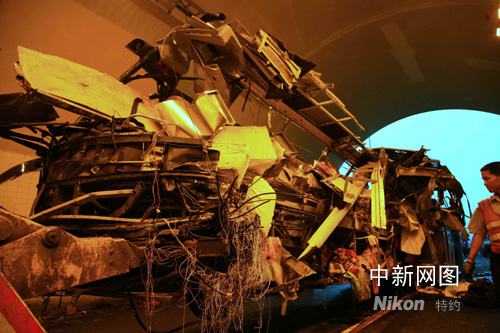 記者趕到現(xiàn)場(chǎng)時(shí),受傷人員已被救出送往醫(yī)院搶救。高速交警、路政等有關(guān)人員正在現(xiàn)場(chǎng)處理,施救人員正在清理路面。一輛臥鋪大客車停在隧道入口的地方,車頭已面目全非,靠駕駛員一側(cè)車身大半像被刀劈開一樣。入隧道口之前的中間護(hù)欄也已被毀,地上滿是客車上掉下外殼、玻璃等殘骸和旅客行李。
