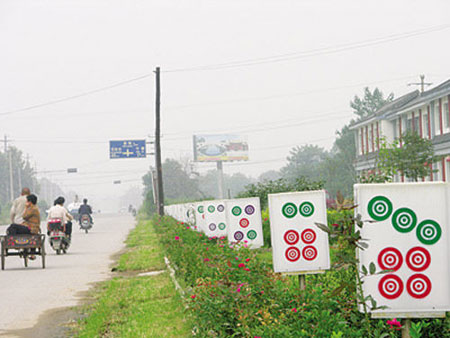 “見(jiàn)過(guò)門(mén)牌號(hào),但像這樣的門(mén)牌標(biāo)志還真是少見(jiàn)!弊蛉眨膛吭诤颖壁w縣看到許多“麻將”形狀的燈箱后說(shuō)。這些燈箱位于趙縣通往趙州鎮(zhèn)的一條小公路旁,引起了路人極大的興趣。