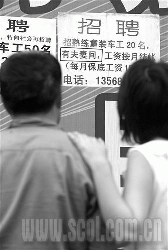 由于正值吃飯時(shí)間,貼滿了用工信息的墻壁顯得很孤單。記者注意到,其中有9張用工啟事明確告知“提供夫妻房”。墻壁對(duì)面一家小賣部老板黃翠芬介紹,平常三三兩兩的男男女女停留在此,尋找就業(yè)和跳槽的機(jī)會(huì),提供夫妻房的工廠或作坊在同等條件下更受人歡迎。