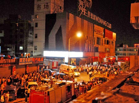 凌晨1時,記者趕到事發(fā)現(xiàn)場,舞王俱樂部占地面積千余平方米,被一片民房包圍,外墻看不出明顯的火災(zāi)痕跡。廣告招牌依然亮著。記者進入三樓俱樂部大廳看到,地面上散落著許多女式?jīng)鲂。俱樂部三四樓一片漆黑,玻璃窗全被打碎,窗口處被濃煙熏得一片漆黑,空氣中還凝聚著一股強烈的焦味。上完樓梯后有一條大約10米長的狹窄過道,在過道的地上全是逃生人員散落的鞋子。大廳中央是個表演舞臺,大廳里擺放著百余張桌子,周圍有十多間包廂。大廳里不少桌子、椅子被掀翻。