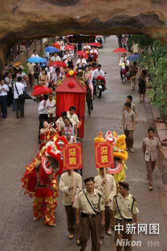 中新網(wǎng)順德9月23日電 (孫建駒 謝俊忠)大鼓擂響,嗩吶聲聲,一支百余米長的迎親隊伍中,有高頭大馬、花轎和卡丁車、電瓶車、摩托車、沙灘車、自行車等交通工具,隊伍熱鬧穿越廣東順德長鹿農(nóng)莊,28對新人在這里舉辦別具水鄉(xiāng)特色集體婚禮。