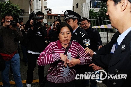 中午10:30 在雨中等待了2個多小時的羅大翠接到一個電話,在通話的過程中,羅大翠的情緒變得更加激動起來,隨即和執(zhí)勤民警交涉起來,試圖越過警戒線,闖進(jìn)法庭。但是兩次努力都被執(zhí)勤民警婉拒。截至27日上午11時30分,周正龍案已經(jīng)開庭審理了3個小時,周正龍妻子羅大翠和兒子仍未被允許進(jìn)入法庭。(記者 錢海峰 陳武)