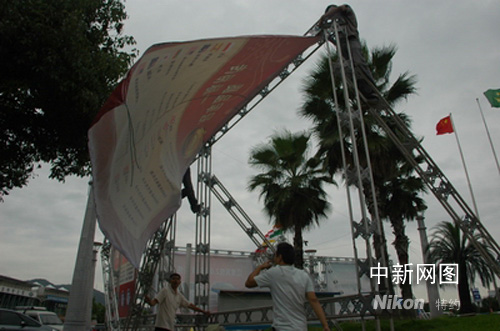 工人在浙江臺(tái)州一國(guó)慶車展現(xiàn)場(chǎng)加固施工,以應(yīng)對(duì)超強(qiáng)臺(tái)風(fēng)“薔薇”的到來(lái)。作者:陳林聰