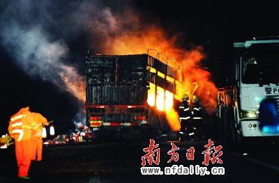事故發(fā)生后,油罐車(chē)上的兩名男子迅速逃生,但大貨車(chē)上的人直到大火熄滅也沒(méi)有走出來(lái)。事故造成京珠高速雙向塞車(chē)數(shù)十公里,高速公路封閉6小時(shí)。目前,清遠(yuǎn)高速交警大隊(duì)拒絕向記者透露具體死亡人數(shù)。