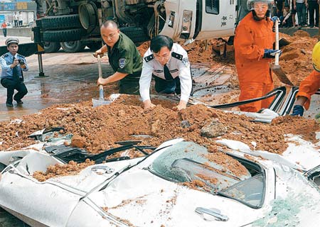 據(jù)記者回憶,10月10日上午10時(shí)50分左右,在深圳市北環(huán)大道西行方向南山立交路段,一輛泥頭車突然失控翻車,將旁邊一輛白色轎車壓扁。事發(fā)后,市交警局局長(zhǎng)劉鳳俊及時(shí)趕到現(xiàn)場(chǎng)組織指揮救援。救援人員調(diào)來(lái)兩輛大型吊車,吊住泥頭車首尾兩處,試圖將泥頭車吊起。但剛啟動(dòng)吊車,救援人員就發(fā)現(xiàn)泥頭車裝載的泥土太重,很可能會(huì)掉落下來(lái)將轎車埋住。經(jīng)現(xiàn)場(chǎng)研究,救援人員決定先挖出部分泥土后,再吊起泥頭車,F(xiàn)場(chǎng)十幾名救援人員迅速拿來(lái)鐵鏟與鋤頭,開始挖土。劉鳳俊沖到泥頭車前,因沒(méi)工具了,他就用手不停地挖泥土,并大叫:“加油挖!”在劉鳳俊的帶領(lǐng)下,現(xiàn)場(chǎng)的幾十名救援人員一起用手刨土救人,最終從車內(nèi)救出一名女嬰。