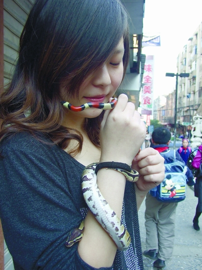 如果在大街上看到寵兒,你一定會(huì)覺得她是一個(gè)時(shí)尚、貌美的美女。如果你仔細(xì)一看,發(fā)現(xiàn)她的手腕上纏著一條色彩斑斕的蟒蛇,會(huì)不會(huì)立刻將你“雷”倒呢?如今在省城合肥,有不少像寵兒一樣的美女帥哥,他們已經(jīng)不屑于養(yǎng)小貓小狗這樣的平常寵物,而是將各種各樣的蛇當(dāng)作自己的“另類寵物”,甚至和蛇同床共枕,卿卿我我。記者昨天就采訪了這樣幾位“都市潮人”。