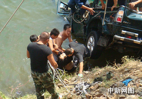 此時距離事發(fā)時間已經(jīng)過去了半個多小時,被困人員的生還幾率十分渺茫。消防人員通過現(xiàn)場偵察得知,小車在行使過程中被撞,由右邊沖過路基墜入落差6米的水庫中。11時30分,消防戰(zhàn)士下水進行搜救。同時,消防部門也調(diào)動大型吊車及牽引車到現(xiàn)場參與救援,利用吊車吊鉤實施起吊營救。