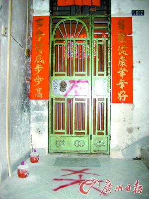 “這種恐嚇行為就是為了將我們逼走!”昨天上午,三水西南街道至華苑6座多名居民向本報(bào)反映,由于與開發(fā)商關(guān)于拆遷補(bǔ)償一直未能達(dá)成協(xié)議,在連續(xù)接到幾個(gè)恐嚇電話后,四戶人家在17日凌晨發(fā)現(xiàn)家門口被人用紅漆噴上了“殺死”等字樣。而負(fù)責(zé)拆遷的公司則否認(rèn)是自己所為,目前住戶已經(jīng)報(bào)警,當(dāng)?shù)鼐揭咽芾碚{(diào)查。