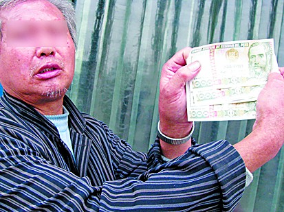 17日,記者在振華路見(jiàn)到了被騙走6000元的譚老先生。他告訴記者,17日下午1時(shí)左右,他在滄口廣場(chǎng)附近收廢品,突然有兩個(gè)20多歲的年輕人與他搭訕。這兩個(gè)年輕人自稱(chēng)來(lái)自福建,與老板三個(gè)人一起來(lái)青島出差。到青島后,他們的車(chē)出了車(chē)禍,老板已經(jīng)被送到了醫(yī)院,急需交住院費(fèi),但是無(wú)奈身上只帶了一些外匯,來(lái)不及去銀行兌換,所以想跟譚先生兌換6000元錢(qián)。其中一個(gè)年輕人拿出5張外匯,每張外匯上標(biāo)有“1000”的字樣,并告訴譚先生,這5張1000元的英鎊值1萬(wàn)多元人民幣。譚先生覺(jué)得很劃算,于是從家里拿了6000元錢(qián)與對(duì)方兌換。