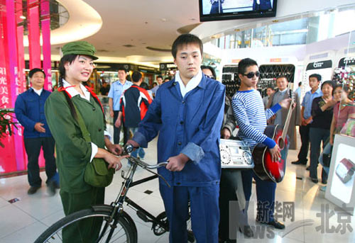 在新世紀服裝商貿(mào)城商場內(nèi),一個改革開放30年服裝變遷展覽與行為藝術(shù)展示同時進行。人們在商場的櫥窗內(nèi)看到:布票、海魂衫、皮爾·卡丹……一系列上世紀七八十年代以來的社會流行用語首先映入眼簾。在櫥窗外,身穿各個年代“標志性服裝”的模特,分別代表著工人、市民和學(xué)生等不同身份的人群。