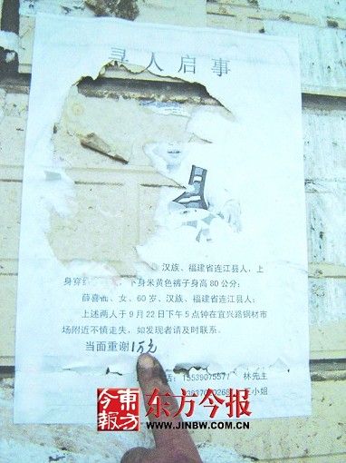 昨日上午,記者在秦西運(yùn)所住的家屬院大門口見(jiàn)到了那張已經(jīng)殘缺的“尋人啟事”,上面寫的與秦西運(yùn)描述的一樣。