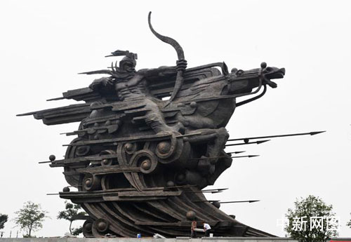 中新網(wǎng)杭州10月23日電(記者 龔讀法 實(shí)習(xí)生 王磊 通訊員 濱宣)日前,歷時兩年的巨型雕塑《錢王射潮》在浙江省杭州市濱江公園正式揭幕。這尊雕塑的是由中國工藝美術(shù)大師韓美林設(shè)計(jì)的,雕塑高29.6米,寬48米,厚15米,全部采用性能優(yōu)良的錫青銅鑄造而成,總重量達(dá)300余噸。