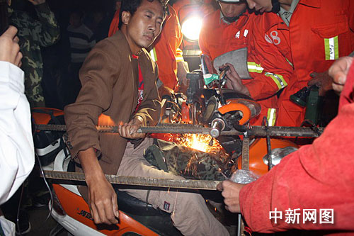 余姚消防大隊接到報警后,調派兩輛消防車9名消防員趕赴現(xiàn)場。在對現(xiàn)場進行了警戒之后,余姚消防大隊的王中隊長利用機動液壓擴張剪先把插入朱先生體內的鋼筋固定后,由另一名消防員用無齒鋸對鋼筋進行切割。為讓切割過程中,朱先生免受高溫傷害,消防員在切割時用水對鋼筋進行降溫,在用完整整一瓶礦泉水后,朱先生終于成功被救出,并送上了救護車。