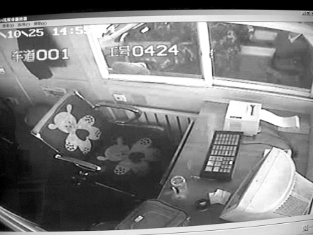 14時55分,一穿迷彩服的中年男子打開車窗,向收費窗口里扔了一個煙頭。隨后該男子下了車,拳腳相加,敲打踢踏收費窗口玻璃。
