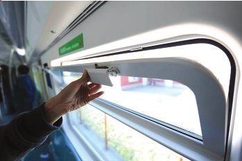 4號(hào)線(xiàn)列車(chē)內(nèi)部最特別的地方是車(chē)窗。普通列車(chē)車(chē)窗是全封閉的,但4號(hào)線(xiàn)列車(chē)每個(gè)車(chē)窗的上弦窗都可開(kāi)啟。乘客只需抬起上弦窗部開(kāi)關(guān),上弦窗便可自外而內(nèi)向上開(kāi)啟30度。這樣既滿(mǎn)足了乘客對(duì)車(chē)內(nèi)通風(fēng)的緊急需求,也保證車(chē)窗打開(kāi)后列車(chē)安全運(yùn)行。