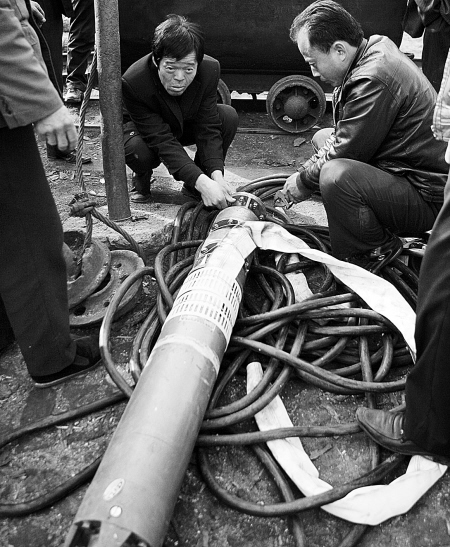 救援人員正在安裝深井泵。