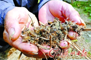 昨日,記者在始興縣沈所鎮(zhèn)大嶺下村養(yǎng)蜂大戶盧春光家中看見,數(shù)百只蜜蜂東倒西歪地掙扎著,還有一百多只蜜蜂則像喝醉了酒似的在空中四處亂飛。