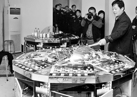 下午3時20分,記者隨民警來到經(jīng)二路一家沒有任何店名的門面房前。這個賭博窩點已聞訊關上了防盜門,記者注意到,門外還張貼著招聘服務員的啟事。民警強行將門打開,只見50多平方米的屋內已空無一人,里面擺著30多臺“動物樂園”等3種賭博機。門口一中年婦女告訴記者,這家賭博廳開業(yè)已有一個月了,“他們害人害己,早該取締了!