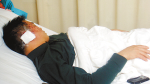 魏宗平耳朵縫了8針躺在病床上。