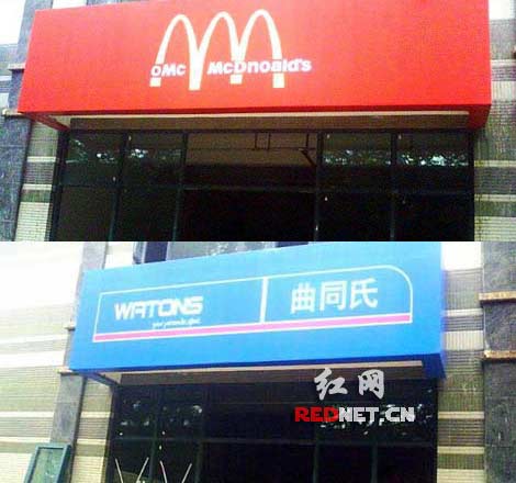 “這擦邊球打得很牛很雷人,真是山寨店鋪大薈萃!”8日晚上,網(wǎng)友“鍋爐工”在紅網(wǎng)論壇發(fā)帖爆料,稱在網(wǎng)上看到一個題為《對不起,我真的被雷到了,南京最雷人山寨店群》的圖片帖,圖片顯示在南京文安街上,林立的店鋪清一色是山寨名牌店鋪,其中屈臣氏、必勝客、麥當(dāng)勞、李寧、星巴克、哈根達(dá)斯等分別被克隆成曲同氏、必勝糊、李明、巴克星、哈根波斯等。