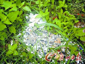 昨日,記者來到東城區(qū)溫塘村文塔路,在墓地走了一圈,發(fā)現(xiàn)這個地方大約有300多平方米,后面是一片竹林,小山頭上雜草眾生,周圍有幾棟爛尾樓,不遠(yuǎn)處有幾間小廠。即使是中午時分,也很少有人經(jīng)過,因7日晚上突然下起大雨,一些未收拾干凈的骨灰聚集在一起,隨著雨水貼在草地上,與重陽節(jié)當(dāng)?shù)卮迕窦雷鏁r留下的鞭炮碎紙片交融在一起。