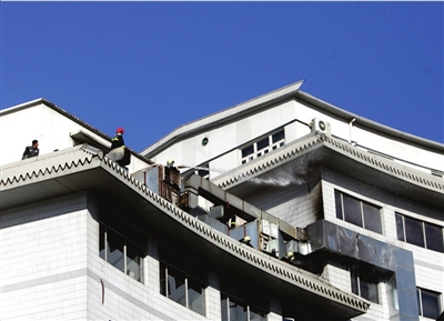 昨天上午9點(diǎn)40分,大廈院外仍停著數(shù)輛警車(chē)和消防車(chē),保安阻止無(wú)關(guān)人員進(jìn)入院內(nèi),百余人站在中天石酒店大堂和院子內(nèi),酒店大堂還有較重焦煳味。大廈一層中部一間屋子外墻被熏黑,現(xiàn)場(chǎng)已無(wú)明火。院內(nèi)垃圾站一員工稱(chēng),西客站郵件處理中心一層廚房著火,火苗竄出屋外并燒至煙道。