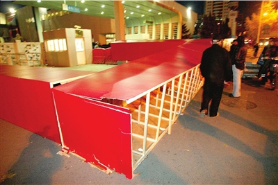 倒地的展板已經(jīng)破碎。周民攝