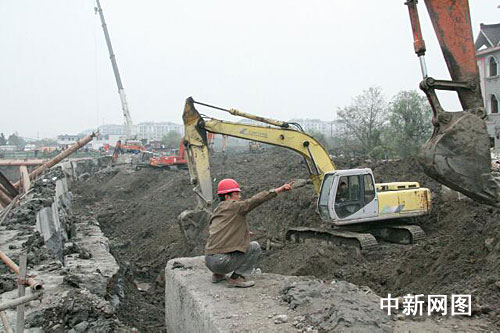 工作人員正在現(xiàn)場指揮挖土機。