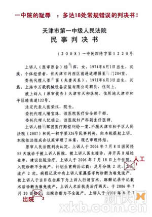 一篇名為《天津某法院多達(dá)18處低級(jí)錯(cuò)誤的終審判決書》出現(xiàn)在某論壇上。一位網(wǎng)名是“哭泣不是懦弱”的發(fā)帖人在帖子中寫道:“這是我2008年11月7日領(lǐng)到的法院終審判決書。一份僅6頁(yè)的判決書,光錯(cuò)別字、丟字等低級(jí)錯(cuò)誤就有18處。這樣一份錯(cuò)誤百出的終審民事判決書還赫然蓋上了"××法院"的公章。難道法官就是這樣的工作態(tài)度嗎?法律的權(quán)威與神圣蕩然無(wú)存!”
