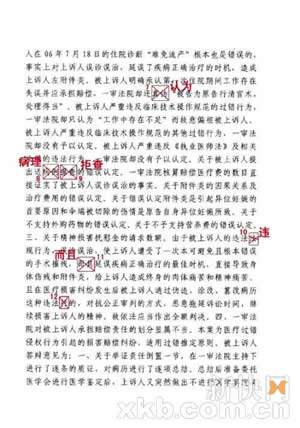 記者在判決書掃描件中的確發(fā)現(xiàn)不少筆誤,比如把“導(dǎo)致”寫成“導(dǎo)治”、“人工流產(chǎn)”寫成“工人流產(chǎn)”、“附件炎”寫成“附件驗(yàn)”和“附件鑒”、“被上訴人”寫成“被上訴們”、“認(rèn)為”寫成“真?zhèn)巍,“拒查”寫成“?jù)查”、“整理”寫成“整體”、“人流史”寫成“人流使”等。