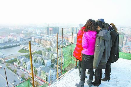 昨日下午3時,記者趕到航海路與未來路交叉口附近的中鼎翡翠2期公園壹號樓盤。記者上到25層樓頂,看到6名女子正站在西側沒有任何防護設施的邊緣。聞訊趕到的管城消防大隊一中隊消防員和航海路派出所民警已經趕到現(xiàn)場,對欲跳樓的6名女子進行勸說。由于風大很冷,記者注意到這些售樓小姐相互之間聚得很緊。