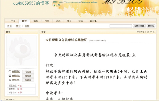 深圳公務(wù)員筆試在本月23日進(jìn)行,24日一早就有考生對(duì)記者反映:今年深圳公務(wù)員考試題泄露了,他已經(jīng)在網(wǎng)絡(luò)上見到了標(biāo)題為“今日深圳公務(wù)員考試答案驗(yàn)證”的博客日志,顯示的發(fā)帖時(shí)間是23日的凌晨1時(shí)24分。該帖發(fā)布試題行政部分與“申論:房市、如何救市”的試題與他參加考試的試題完全一樣。