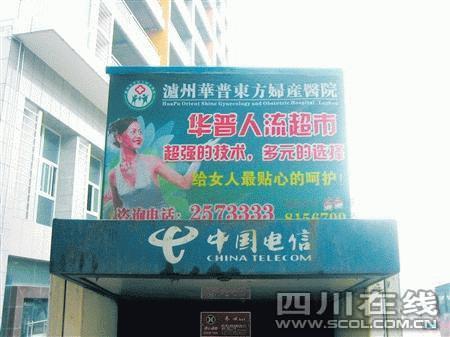 本學(xué)期開學(xué)以來,一位瀘州十五中女生家長多次反映學(xué)校附近人行道電話亭上的華普東方醫(yī)院廣告涉嫌違規(guī)!疤幌裨捔,他們居然打出‘ 人流超市’的宣傳。是不是說‘人流’就像進(jìn)商場買東西一樣簡單嘛?”該家長認(rèn)為,人工流產(chǎn)是一件對女性身體傷害極大的事情,年輕女性應(yīng)該盡量避免。醫(yī)院如此打出人流廣告,是暗示人流像在超市購買商品一樣簡單,對女性尤其是少女健康不利。“他們還把廣告打在學(xué)校附近,對正處于成長發(fā)育期的孩子非常不利。我真擔(dān)心女兒受到影響!”接到家長反映后,記者在城區(qū)連江路十五中附近和前進(jìn)中路一帶發(fā)現(xiàn)了這些廣告。廣告都發(fā)布在人行道電話亭頂部,約兩平方米大小,除了宣傳醫(yī)院名稱、超強技術(shù)等內(nèi)容外,“華普人流超市”作為廣告主體內(nèi)容顯得格外顯眼。