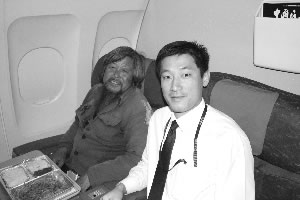 下午2點(diǎn)半,飛機(jī)起飛了,徐超朝窗外看個(gè)不停,說(shuō):“云真好看。很穩(wěn)當(dāng),比坐火車舒服!庇浾吒嬖V他,如果有什么需要,比如要去洗手間什么的,可以跟記者說(shuō)。徐超卻說(shuō),“我不知道飛機(jī)上有廁所,我不想給飛機(jī)上添麻煩,所以上午沒喝水,連午飯都沒敢吃!毙斐從口袋里掏出兩個(gè)干凈的塑料袋,“我連垃圾袋都準(zhǔn)備了,怕飛機(jī)上沒地方吐痰。”