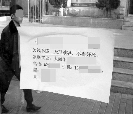 由于債務(wù)糾紛,煙臺(tái)一市民慘遭“大字報(bào)”惡意侮辱,其家庭住址、電話號(hào)碼,甚至妻兒姓名均被人張貼公布,并被詛咒“不得好死”。對(duì)于這種極端的做法,法律界人士認(rèn)為太荒唐。 12月1日13點(diǎn)50分,記者在煙臺(tái)市區(qū)大海陽路仁愛醫(yī)院公交站點(diǎn)看到,眾多等車的市民湊在站牌下,圍觀一張貼在站點(diǎn)玻璃上海報(bào)一樣的紙張。記者看到,這張紙居然是一份“大字報(bào)”,上面寫著“×××欠債不還,天理難容,不得好死”等內(nèi)容,并將“欠債者”的家庭住址、電話號(hào)碼、手機(jī)號(hào)碼以及妻子、兒子的姓名全部公布出來。在這份“大字報(bào)”旁邊,還有另一張內(nèi)容一樣的,只不過已被人撕去大半。候車市民見到這樣一張言辭惡劣的“大字報(bào)”,無不嘆息搖頭。
