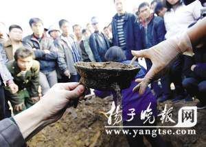 記者聞?dòng)嵹s到現(xiàn)場(chǎng)時(shí),古墓旁邊已圍了二三十人,在人群中央,兩名婦女各拿著一把鐵鍬,站在一青磚砌的大坑里,挖出的長(zhǎng)方形青磚堆在一邊,旁邊還有4個(gè)青瓷罐,其中一個(gè)有臉盆大小。如此完整的青瓷罐,光滑如新,吸引了許多人觀看、撫摸,其中一名圍觀者還打開青瓷罐邊上的一個(gè)黑塑料袋,發(fā)現(xiàn)里面竟有剛挖出來(lái)的兩個(gè)青銅器,其中一個(gè)青銅器已被損壞,成了幾片。