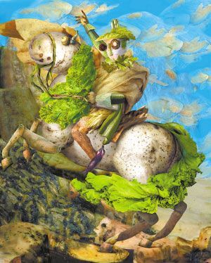 桔多淇在產(chǎn)生蔬菜作畫的想法后,就開始轉(zhuǎn)悠北京的菜市場。她去買菜,看到長相怪異的生姜,眼里就會(huì)大放異光,迅速下手,而走到賣豆腐的面前,也不說話,拿出相機(jī)就對(duì)著白花花的豆腐開拍。桔多淇說:“菜販以為是媒體搞衛(wèi)生監(jiān)督,嚇得不行,其實(shí)只是因?yàn)槲易觥蹲詈蟮耐聿汀返淖雷有枰艽笠粔K豆腐,我買回家也吃不完,于是就在菜市場拍了回家用電腦處理合成!苯鄱噤空f,她尋找原料的菜市場幾乎每一個(gè)菜攤她都“光顧”過,并且對(duì)菜市場邊角余料情有獨(dú)鐘,甚至還會(huì)四處“撿”菜。