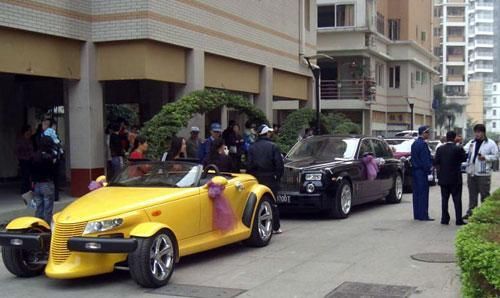 貌似并不高檔的小區(qū)內(nèi),卻出現(xiàn)了超豪華的強(qiáng)悍車隊:“獵獸”開頭,后面跟著三輛“幻影”,以及“賓利”“世爵”等車(如圖)。昨日,一則《福州某集團(tuán)老總嫁女,豪車云集》的帖子在某網(wǎng)站論壇走紅,該帖描述在福州的碧水芳洲小區(qū),某集團(tuán)老總嫁女,眾多豪車云集,場面壯觀。眾多網(wǎng)友稱,已被這些豪車震得說不出話來了。(成都晚報)