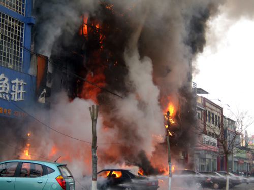下午四點(diǎn),記者從中銀大道鑫源福瑞特超市出來(lái),發(fā)現(xiàn)北方有大量煙霧,順煙霧而去,在建設(shè)路口與消防車(chē)相遇,共同趕往事發(fā)地點(diǎn)。中銀大道已經(jīng)圍滿(mǎn)了人群,著火的商店火勢(shì)猛烈,被燒碎的玻璃啪啪直往下掉,門(mén)前的汽車(chē)也著了,一輛為晉M89550的紅旗轎車(chē)已經(jīng)燒的面目全非了。