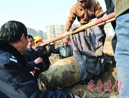聽(tīng)說(shuō)挖掘機(jī)刨出個(gè)“煤氣罐”,12月13日晚11點(diǎn),濟(jì)南濟(jì)安街附近一建筑工地上的張師傅跑去看熱鬧。這“煤氣罐”挺怪:兩頭尖,中間胖。有人猜測(cè):“不會(huì)是炸彈吧!”民警趕來(lái)查看后,現(xiàn)場(chǎng)豎起牌子:“危險(xiǎn)!”