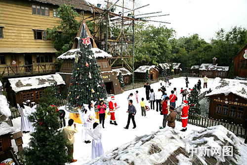 記者在廣東順德長(zhǎng)鹿農(nóng)莊看到,這座山寨版圣誕老人村子上空正飄灑著晶瑩雪白的“雪花”,整個(gè)圣誕老人村銀裝索裹,不少游客和天使打扮的美女們正在村內(nèi)游玩,令人仿佛置身于北國雪域之中。