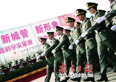 12月16日,番禺城管舉行“閱兵”儀式。據(jù)《新快報》