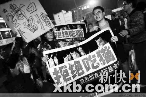 在廣場上,一見“聞貓即興”等人出來了,其他人都著急地圍上去詢問。盡管結(jié)果不是太讓人滿意,但大伙還是決定在廣場上舉行一次小型的抗議活動。100多人圍在一起,高舉著“請發(fā)揚人道主義,放過它們”、“請口下留情”、“拒吃貓肉”等紙牌,喊著口號。并有細心的網(wǎng)友拿著印制好的傳單,向候車的乘客宣傳“不吃貓肉”。對此,路人大都報以一笑。