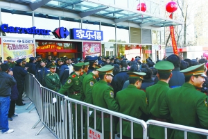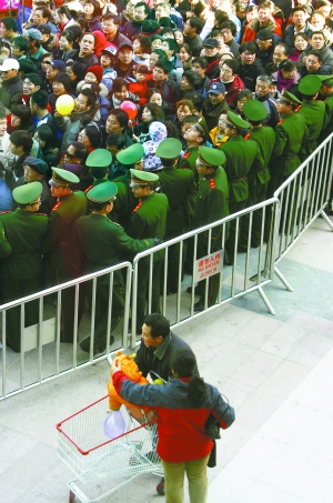 “新店開張,油、米、面、肉低價(jià)促銷,還發(fā)券,能不吸引人嗎?”李先生說(shuō),昨日上午9時(shí)許,他原準(zhǔn)備趕在超市剛開門就進(jìn)去轉(zhuǎn)轉(zhuǎn)。但一到萬(wàn)達(dá)廣場(chǎng),只見家樂福門口聚集著大量顧客,數(shù)百人的隊(duì)伍早就排至數(shù)十米外,并還在不斷膨脹。為維持秩序,工作人員在隊(duì)伍兩側(cè)安置了簡(jiǎn)易護(hù)欄,同時(shí),數(shù)十名武警一字站開,引導(dǎo)眾人進(jìn)入超市。