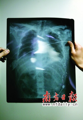 昨日凌晨,周雙明病情告危被轉(zhuǎn)送到廣州的醫(yī)院搶救。周先生告訴記者,照過(guò)X光片后,醫(yī)生說(shuō)周雙明心臟、肺、胃、肝和腸中了100多顆小彈丸。截至記者昨晚8時(shí)發(fā)稿時(shí),周雙明還在重癥監(jiān)護(hù)室中,醫(yī)生說(shuō)要等到晚上才能動(dòng)手術(shù)。