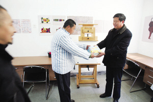捐贈(zèng)儀式上,張金寶代表同伴們從蔣卓平手中接過(guò)了畫筆等繪畫材料,兩年來(lái)他想繼續(xù)畫畫的心愿終于實(shí)現(xiàn)了。對(duì)最具天才的張金寶來(lái)說(shuō),他并不著急動(dòng)筆,他摸摸自己腦袋告訴記者說(shuō):“好長(zhǎng)時(shí)間不畫了,腦子有點(diǎn)空,畫什么我要再想想……”