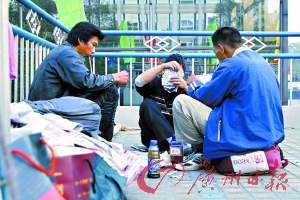 來自黑龍江的老頭其實不到50歲,雙手有殘疾。他和來自甘肅的小軍已經“搭檔”了一年多,關系最好。聽老頭說,還在北京時,小軍當保安,他燒鍋爐,兩人就冒充過便衣警察和嫖客,到酒吧里抓小姐,“弄”到了好幾個包。后來活做膩了,兩人開始流浪,結伴南下。從北京到廣州,一路風餐露宿,足足走了半年才到。最后選定了人民北天橋這個據點。